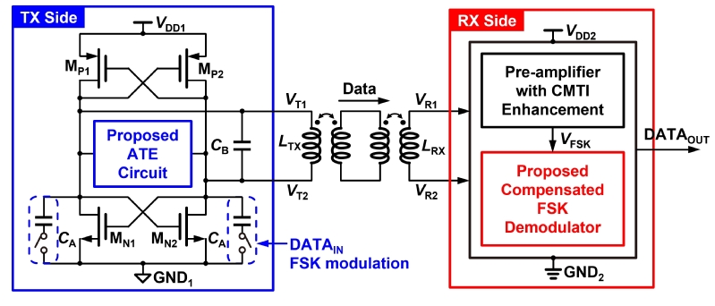 用于隔离式栅极驱动的数字隔离器因其能够有效抑制CMT干扰,成为GaN功率管隔离栅极驱动的重要研究方向。然而,在传统设计中存在两大问题:一、采用传统频移键控(FSK)解调器会引起数据符号持续时间不等,从而进一步导致功率器件直通电流或较大的反向导通损耗;二、传统测量中仅给出静态CMTI指标,即在测量的过程中假定传输速率为零,而面向真实场景的动态CMTI指标较为匮乏。