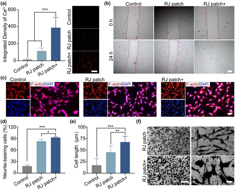 图3 RJ patch在光电刺激条件下对PC12细胞行为的影响。(a)钙离子(Ca²⁺)内流图像;(b)划痕实验评估的细胞迁移能力;(c)细胞F-actin染色观察细胞形态;(d-e)神经突起阳性细胞比例与神经突起长度;(f)SEM观察下PC12细胞在RJ patch上形貌。