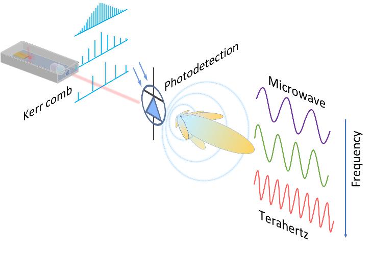 近日,独播库 谢臻达教授、贾琨鹏助理教授团队与紫金山实验室/东南大学朱敏教授团队、中国科学院苏州纳米技术与纳米仿生研究所梁伟研究员团队展开合作,采用自主研发的全集成光纤微腔光学频率梳,在低噪声频率合成和高速太赫兹无线通信研究中取得重要突破,对于新一代通信技术发展具有重要意义。2025年7月7日,相关成果以“Low-noise frequency synthesis and terahertz wireless communication driven by compact turnkey Kerr combs”为题,正式发表于《Nature Communications》期刊上,祝世宁院士和尤肖虎院士在该研究工作中给予了关键指导。