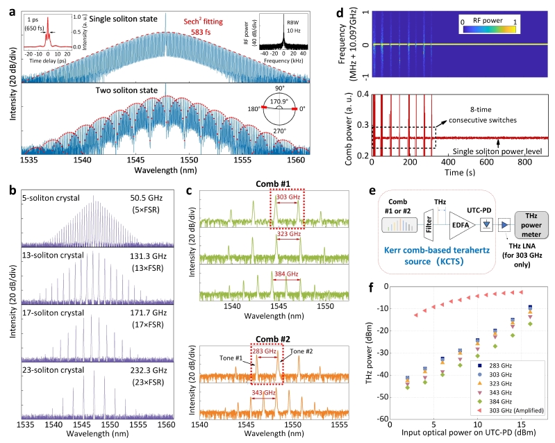 该集成化微腔克尔光频梳不仅具备可重复启钥启动特性,更在相位噪声性能上实现重大突破,首次在集成化微腔光频梳系统中实现近量子噪声极限的相位噪声性能。通过不同孤子态的自由切换,可实现从10GHz微波频段到300GHz太赫兹频段的低噪声频率合成。该光生太赫兹器件的相位噪声指标已经低于传统微波测量方法的极限,因此团队提出两个太赫兹源直接拍频的基波混频噪声测量方法,成功在300 GHz频段测得偏移10 kHz处–95 dBc/Hz、底噪达–133 dBc/Hz的业界领先指标,刷新了当前微腔光频梳太赫兹频率合成的相噪纪录。