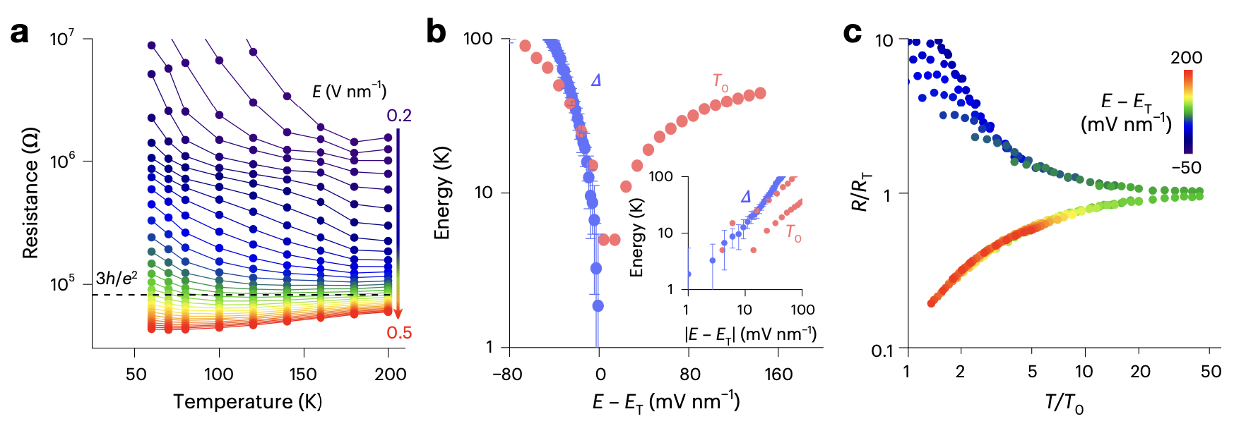 Figure 3. Disorder-driven metal-insulator transition and quantum critical scaling behavior. (a) Sheet resistance versus temperature under different electric fields. (b) Activation gap Δ and temperature scaling parameter T0 as the electric field E approaches the critical field ET. (c) Resistance-versus-temperature curves near the metal-insulator transition.