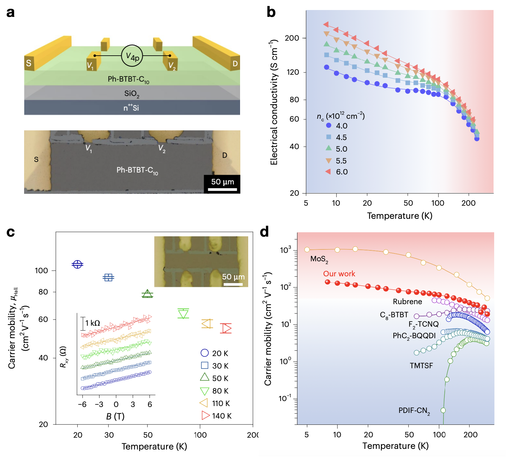 Figure 2. Metallic charge transport over an ultrawide temperature range. (a) Schematic of the four-probe device structure and the corresponding optical micrograph. (b) Conductivity versus temperature at different carrier concentrations. (c) Hall mobility versus temperature. (d) Statistics of high-mobility organic single-crystal semiconductors.