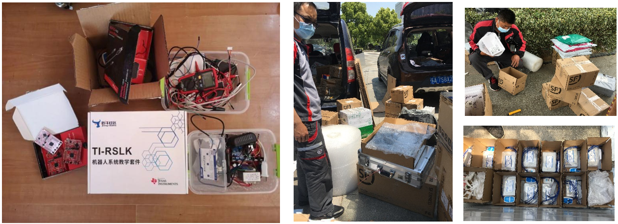 For entrepreneurship and innovationcompetition training, in addition to theoretical knowledge, practical links are more important. Before and during the course, the electronic experimental center made a comprehensive survey and evaluation of the students who selected courses. Through the online class, the students were given a comprehensive explanation of theoretical knowledge and video display. Considering that pure theoretical study and simulation experiments can no longer meet the students' needs for competition training , the understanding of knowledge is obviously greatly discounted. But the valuable experimental kits are limited, what’s more, students who are not familiar with the kits may have a certain security risk, so it can not be popularized to each student. Teacher Zhang Zhijian, deputy director of the experimental center, organized a meeting of the teachers in charge of the course to discuss and determine the selection list, and then, according to the situation of the competition team and the focus of each student's study, tailored the learning package and sent out the gift packages for the competition training. Each package contains: UAV experimental box, UAV vision module, single-chip microcomputer, circuit board components, robot intelligent car kit, soft and hard application kit. While sending out these learning packages , students are required to learn and communicate with each other under the premise of safety and they can work as a team.