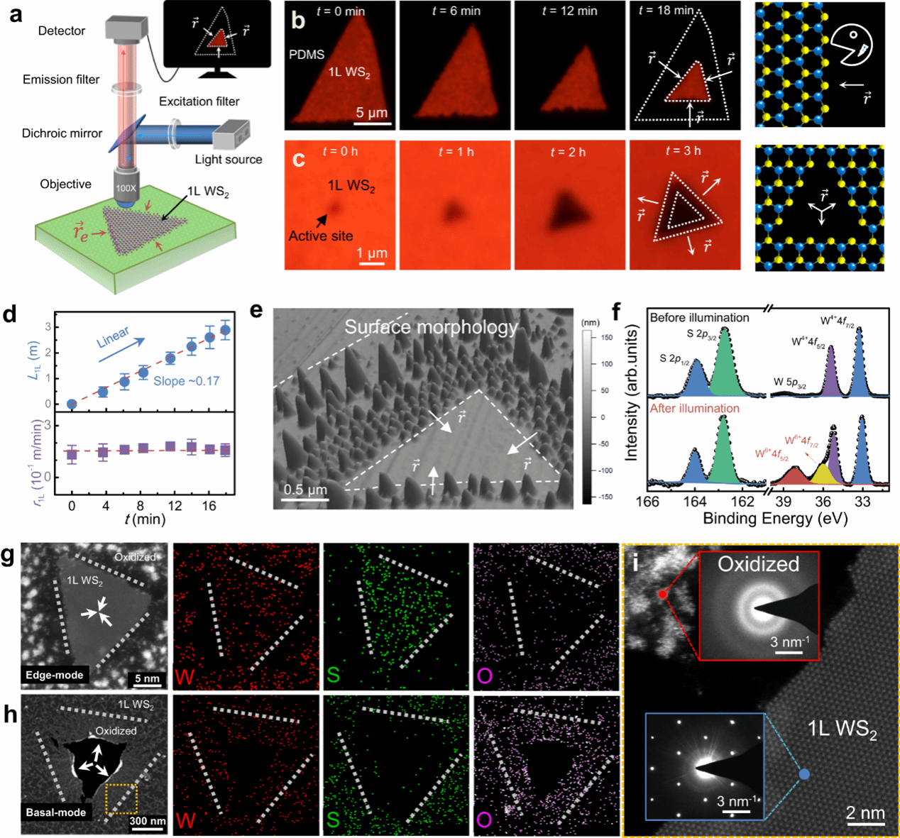 Fig. 1: Photoluminescence-traced photo-oxidation process in monolayer (1 L) WS2 .