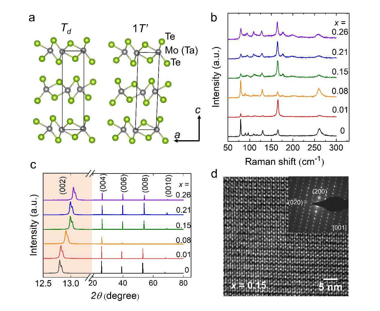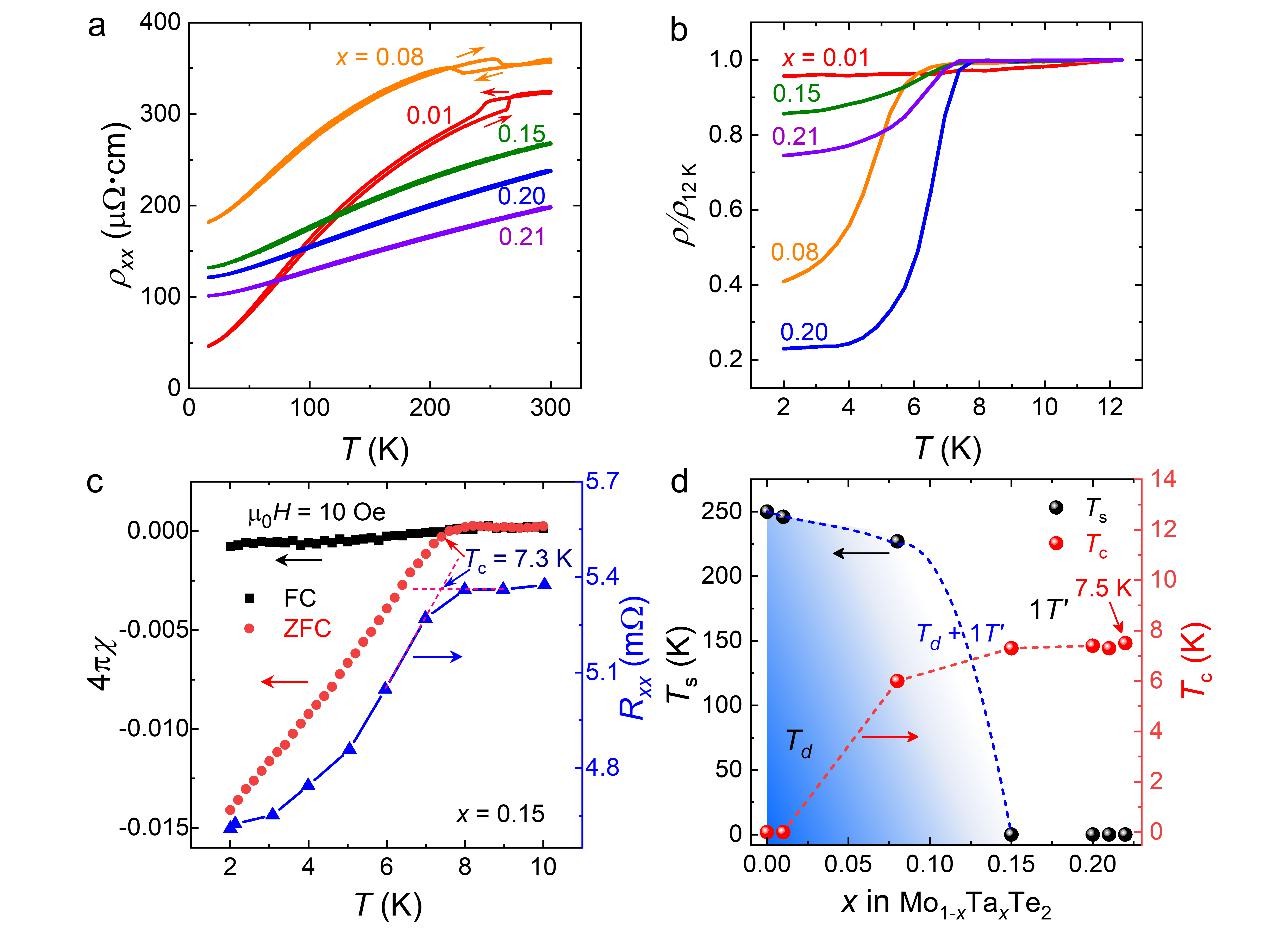 图1. Mo1-xTaxTe2单晶的结构表征结果。 从样品的电学输运测量曲线(图2a)可以看到在低掺杂样品中(x ≤ 0.08)升温和降温曲线出现了变温电阻曲线的明显回滞,这通常是由MoTe2中的低温Td相与高温1T’相之间的结构相变所致。随着掺杂浓度大于或等于0.15,低温的Td相会被完全压制而不呈现电阻回滞。而在低温区,可以观察到x ≥ 0.08的样品低温电阻骤降突变(图2b),预示着超导迹象,但还没完全到零电阻,这归因于超导体积占比过低(~1.4%)的情况。通过进一步的抗磁性测量,能观察到很明显的迈斯纳效应,证明其低温电阻的骤降突变来源于超导相变(图2c)。基于以上的MoTe2随掺杂浓度变化的结构相变和超导相变结果,勾画出了如图2d所示的半拱形相图。