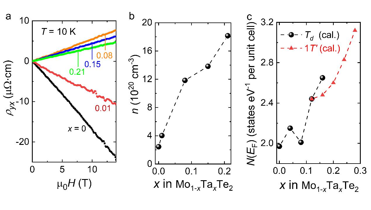 图2.确定Mo1-xTaxTe2中的Td-1T’结构相变和超导相变。 为了进一步揭示Ta掺杂MoTe2单晶中超导增强的来源,器件霍尔测量和第一性原理计算均给出了合理的解释。通过分析霍尔测量数据,发现参与输运的载流子浓度随着Ta掺杂浓度的增加而提高,从未掺杂至掺杂浓度x = 0.21,载流子浓度几乎提高了一个数量级(图3b)。这说明Mo1-xTaxTe2单晶中超导性能的提高来源于费米面处载流子浓度的巨大提升。第一性原理计算也从能带结构上给出了和实验测量上类似的结果,也就是说Ta替位掺杂能显著提高费米面处的态密度(图3c)。