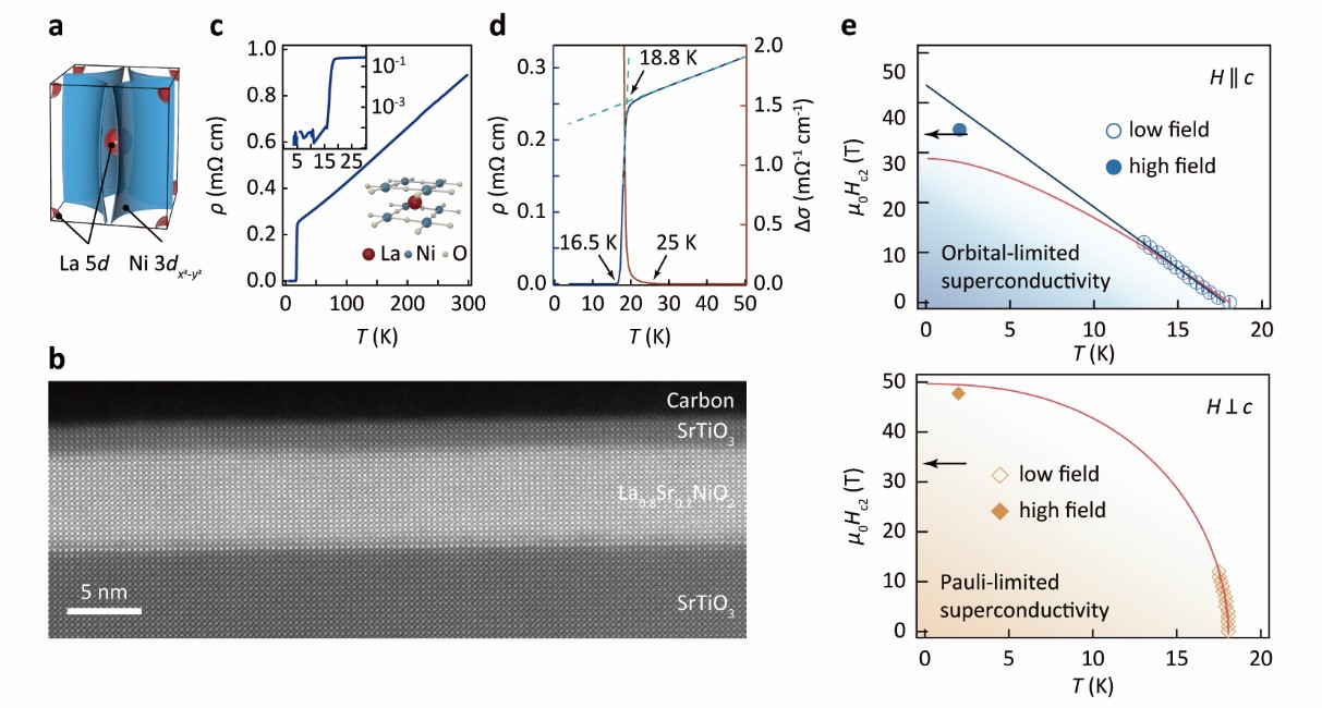 近日,独播库 现代工程与应用科学学院聂越峰教授课题组与独播库 王学锋教授课题组合作,通过制备高质量的镍基超导薄膜(La0.8Sr0.2NiO2)及系统的磁输运性质研究,揭示了该体系中存在与铜基超导类似的上临界场各向异性,为理解镍基超导机制提供了新的实验结果。 自1986年铜氧化物高温超导体被发现以来,非常规高温超导机理一直处于凝聚态物理的研究前沿。无限层镍氧化物作为一类新型的非常规高温超导体系,具有与铜基超导体类似的准二维层状晶体结构以及3d9最外层电子构型,为高温超导机理的研究提供了一个崭新的平台。理论与实验研究表明这两类超导体系也存在明显的区别,比如镍基超导体的费米面存在明显的多带特征,这与铜氧化物中被广泛接受的单带物理图像不一致,研究它们之间的联系与区别对揭示非常规高温超导的机制尤为重要。对于超导体而言,上临界场(Hc2)可以给出关于超导维度以及库珀对(Cooper pairs)拆对机制等重要信息,为理解超导机理提供重要帮助。前期研究发现,Nd1-xSrxNiO2体系的上临界场呈现出泡利顺磁极限所导致的各向同性特征,这一结果与铜基超导体中单带物理所主导的各向异性的输运性质有着显著的不同,为理解非常规高温超导机制带来了新的挑战。