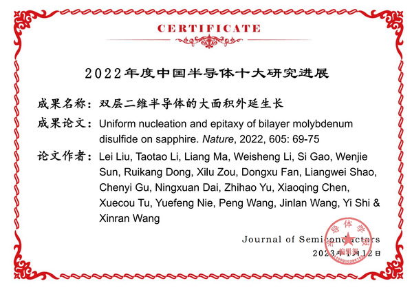 2. Lei Liu†, Taotao Li†*, Liang Ma†*, Weisheng Li†, Si Gao†, Wenjie Sun†, Ruikang Dong†, Xilu Zou, Dongxu Fan, Liangwei Shao, Chenyi Gu, Ningxuan Dai, Zhihao Yu, Xiaoqing Chen, Xuecou Tu1, Yuefeng Nie, Peng Wang, Jinlan Wang*, Yi Shi & Xinran Wang*. Uniform nucleation and epitaxy of bi-layer molybdenum disulfide on sapphire. Nature, 2022, 605, 69-75.†contributed equally. *Corresponding author. Hot Paper (top 0.1%)