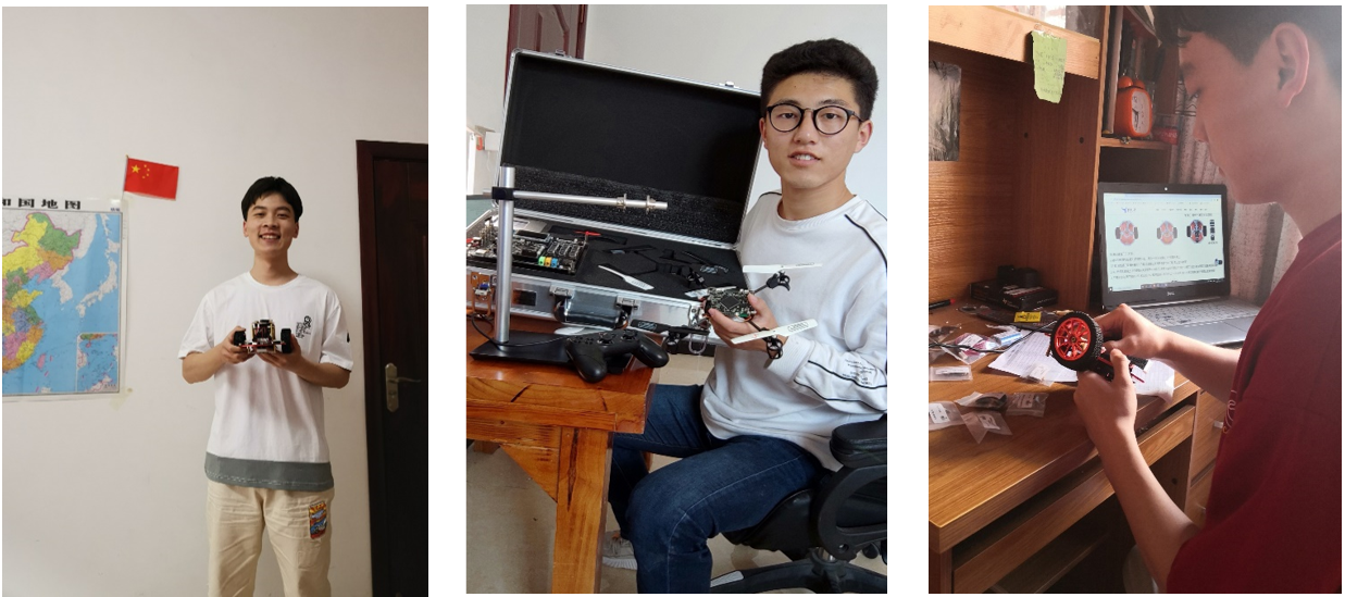 For entrepreneurship and innovationcompetition training, in addition to theoretical knowledge, practical links are more important. Before and during the course, the electronic experimental center made a comprehensive survey and evaluation of the students who selected courses. Through the online class, the students were given a comprehensive explanation of theoretical knowledge and video display. Considering that pure theoretical study and simulation experiments can no longer meet the students' needs for competition training , the understanding of knowledge is obviously greatly discounted. But the valuable experimental kits are limited, what’s more, students who are not familiar with the kits may have a certain security risk, so it can not be popularized to each student. Teacher Zhang Zhijian, deputy director of the experimental center, organized a meeting of the teachers in charge of the course to discuss and determine the selection list, and then, according to the situation of the competition team and the focus of each student's study, tailored the learning package and sent out the gift packages for the competition training. Each package contains: UAV experimental box, UAV vision module, single-chip microcomputer, circuit board components, robot intelligent car kit, soft and hard application kit. While sending out these learning packages , students are required to learn and communicate with each other under the premise of safety and they can work as a team.